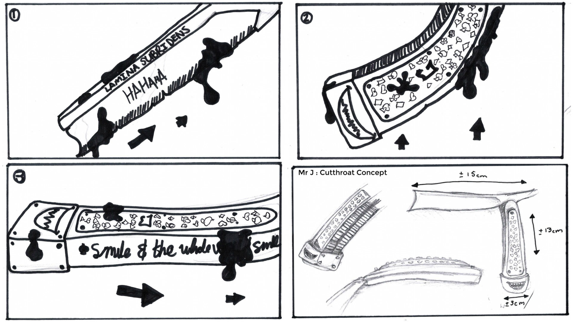 We open on an ambient and dark environment. The handle of a cut throat razor enters the frame, on the handle is embossed lettering. As we explore the cut throat's surface, parts are covered in bright colored paint splatters.We explore the paint-covered surface of the cutthroat from handle to blade. All along custom design element on the razor give us glimpses at of the Joker's story and his mindset.